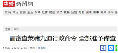 《聯合報》報道稱,9項行政命令在“立法院”朝野表決戰攻防下,24日下午5時45分全數完成備查,元旦開放“萊豬”進口成定局。國民黨主席江啓臣24日傍晚與黨籍“立委”對沒能擋住“萊豬”鞠躬向民眾道歉,並表示戰線將拉到“反萊豬公投”。