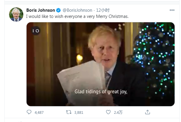 當地時間12月24日晚,英國首相約翰遜向民眾發表聖誕講話。在視頻中他激動地展示了剛剛達成的脱歐協議,稱這是一份送給英國民眾的聖誕節“小禮物”。