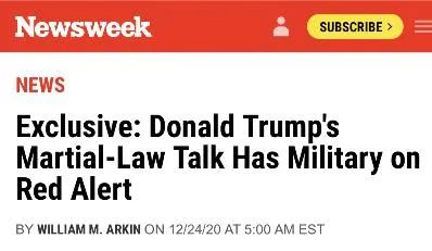 報道稱,在某些方面,美國軍方已經被捲入了這個問題。特朗普總統的首任國家安全顧問、最近被總統赦免的重刑犯邁克爾-弗林(Michael Flynn)退役中將,上週公開提出了戒嚴令的話題。他説,總統應該動用軍隊奪取大選,在某些州重新舉行選舉。弗林説:“總統可以採取軍事力量,基本上重演選舉,總統必須為每一種可能的情況做好計劃,我們不能允許這次選舉或選舉的公正性被保持成這樣。”
