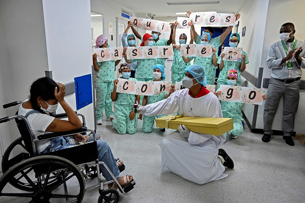 2020年6月26日,哥倫比亞卡利市,新冠肺炎患者戴安娜·安格拉出院,男朋友Jefferson Riascos跪地求婚,醫護人員舉着“你願意嫁給我嗎”的橫幅祝福二人。前幾日戴安娜·安格拉在昏迷狀態下成功剖腹產產下兩人的孩子。