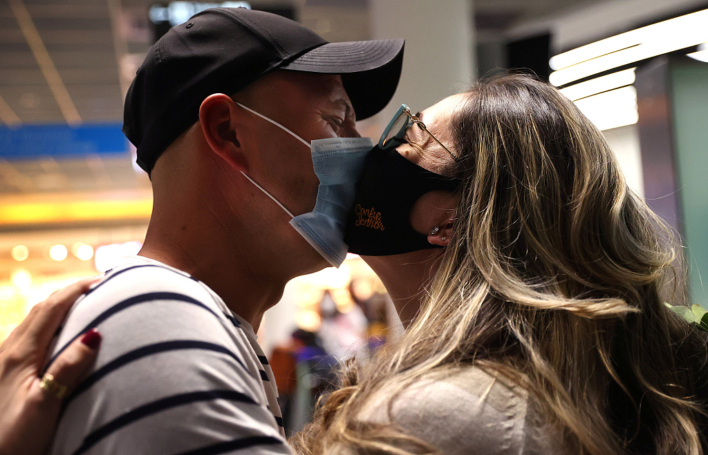 2020年8月15日,德國法蘭克福,弗洛裏安·梅勒和他的巴西女友雷納塔·阿爾維斯在因疫情分離半年後重逢。