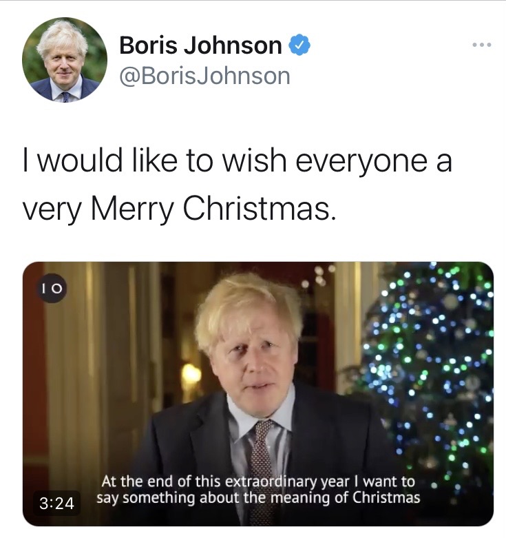 視頻開始,約翰遜先是談論了今年聖誕節的特殊所在。他説:“我從沒有見識過這樣的聖誕節,一輩子的沒有。我打賭你們在一生當中也沒見過。在大多數年份,(聖誕節)這個時刻意味着團聚和慶祝……但是今年,我們卻‘過不起’這樣的聖誕節,這讓我心痛。”他説,自己祈禱情況會變得儘可能地正常起來。