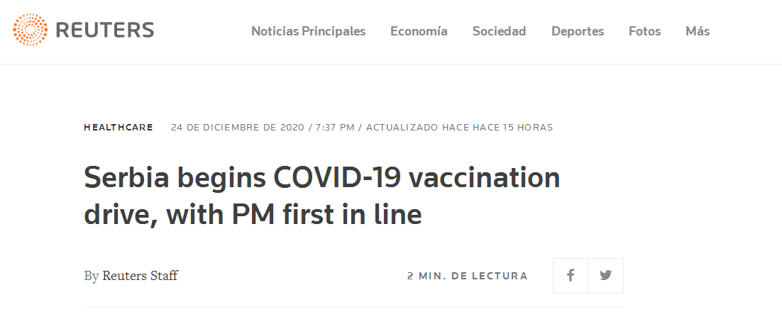 報道説,約4875劑輝瑞公司的新冠疫苗22日被空運至塞爾維亞,該國成為巴爾幹地區第一個接種新冠疫苗的國家。布爾納比奇24日在首都貝爾格萊德接種疫苗後表示,“我很榮幸能夠為我的國家做這件事,成為第一個(接種新冠疫苗的人),為其他公民(接種疫苗)鋪平道路。”