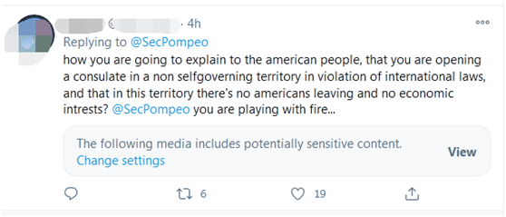 另一位網友説,“你將如何向美國人民解釋,你在一個非自治領土(爭議地區)上開設領事館其實是違反了國際法,並且這裏沒有任何美國人和任何經濟利益?@蓬佩奧 你在玩火……”↓