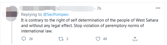 一位網友説,“它違反了西撒哈拉人民的自決權,沒有任何法律效力。停止違反國際法強制性規範的行為。”↓