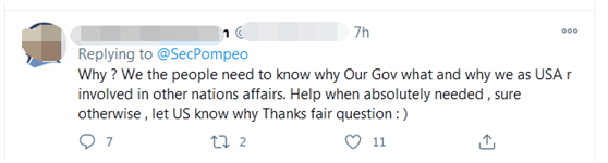 一位網友説,“為什麼?我們想要知道,為什麼我們的政府、為什麼我們美國要干涉其他國家的事務。如果實在需要的話(美國)可以提供幫助,否則就請告訴我們(干涉的)原因,謝謝請回答”↓