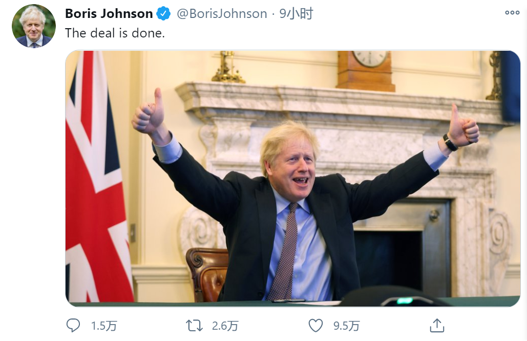 鮑里斯·約翰遜激動地在他的推特賬號寫道:“搞定”,並置頂了該推。