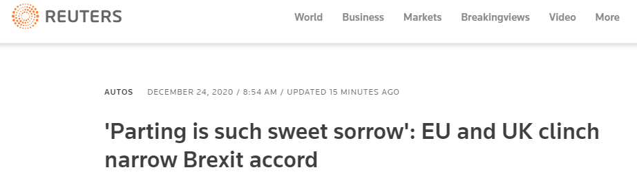 一別兩寬,各自歡喜。路透社特意把歐盟委員會主席馮德萊恩(Ursula von der Leyen)在現場説的一句話放在了題目裏: