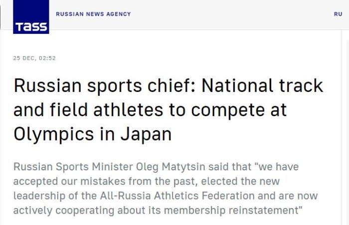 中新網12月25日電 據俄羅斯塔斯社報道,當地時間24日,俄羅斯體育部長馬特欽在莫斯科的一個活動上表示,俄羅斯的優秀田徑運動員將有機會參加2021年在日本舉行的東京奧運會。