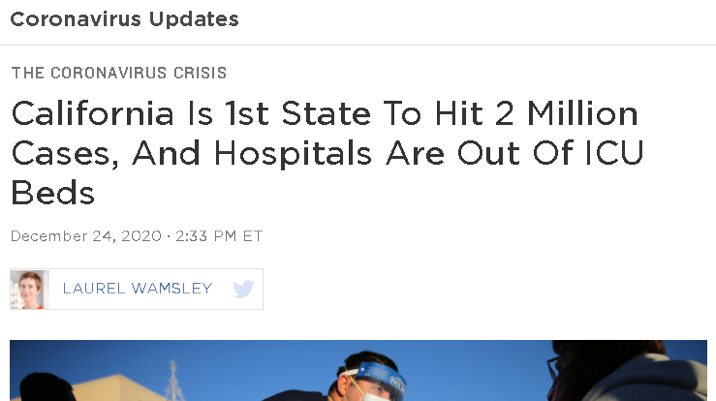 △NPR報道,加州是美國第一個累計病例數超過200萬的州,而該州醫院重症監護病房幾乎飽和