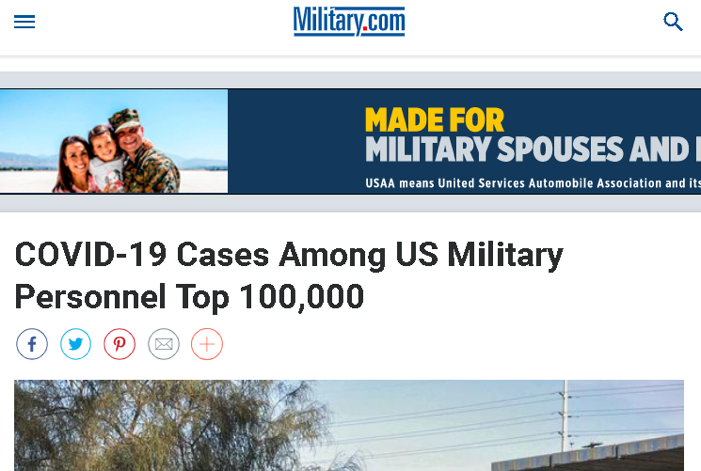 △美國“軍事”網站報道,美軍部隊的累計新冠感染病例數已經突破10萬例