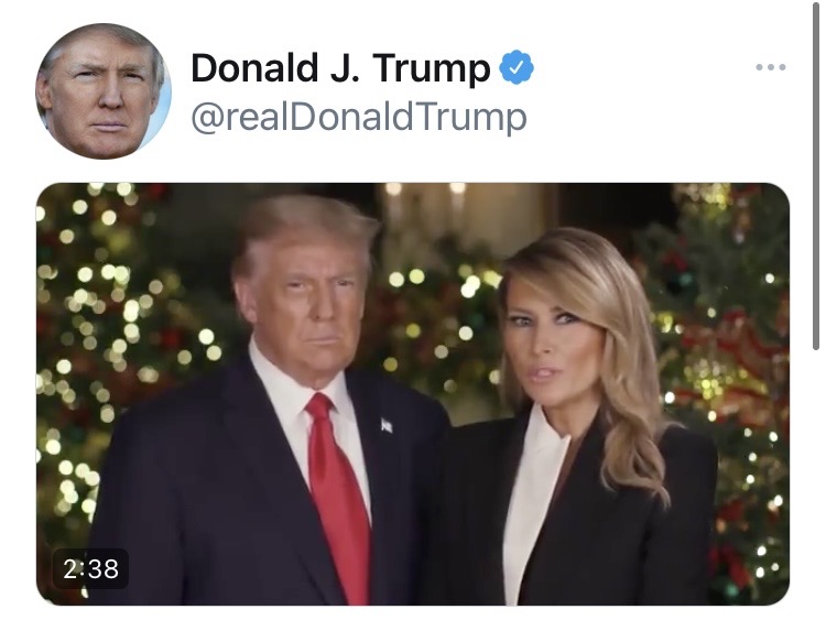 在視頻中,他和他的夫人梅拉尼婭送出了聖誕祝福,並對美國的醫護工作者、疫苗研發人員表示感謝,並猛誇疫苗是“聖誕奇蹟”,將很快結束這次疫情。