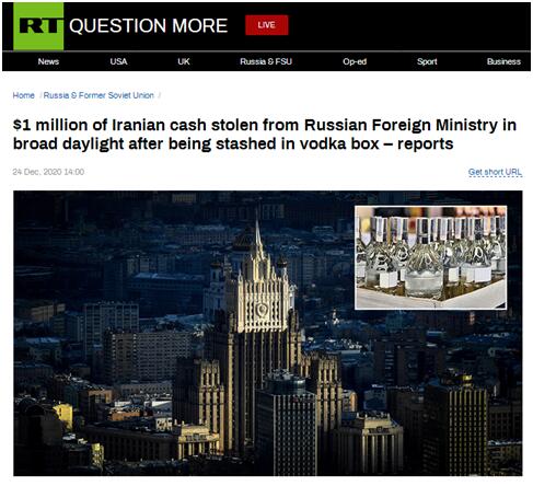 報道援引俄羅斯REN TV電視台報道稱,失竊資金是伊朗方面支付的有關領事服務的150萬美元的一部分。由於美國對伊朗銀行系統實施制裁,伊朗使用現金支付。這筆錢本被裝在兩個袋子和一個密封酒盒裏,然後由外交官們快遞送達(俄外交部)財政部門首席專家納塔利婭•阿格特索娃(Natalia Agaltsova)的辦公室。