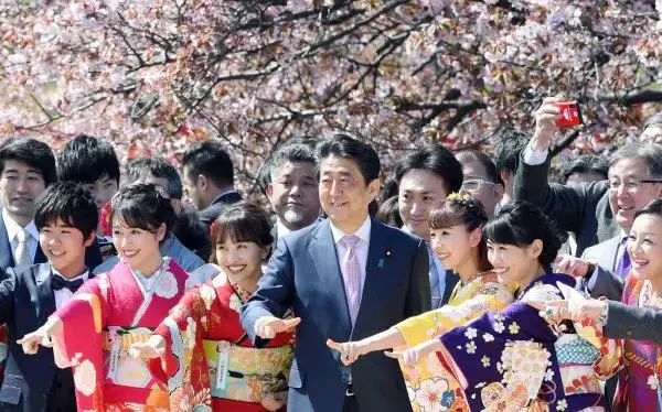 2019年4月,安倍與“賞櫻會”參加者拍攝紀念合影(圖源:日本經濟新聞)