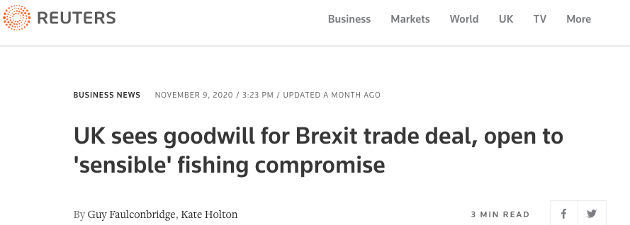 隨着截止時間的逐步逼近,“無協議脱歐”的風險加劇,鮑里斯·約翰遜的壓力也相應增大。在12月7日,英國政府作出讓步,放棄《內部市場法案》中的爭議部分。英歐雙方存在的主要爭議也只剩下漁業一項。而在23日,法國媒體報道稱,有歐盟消息人士透露,英國在漁業問題上作出了“巨大讓步”,讓這最後一個難題也得到解決。