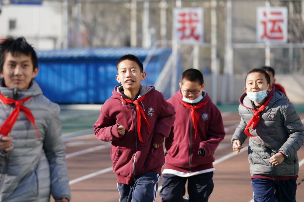 12月21日,在北京四中廣外校區,蔡昊霖(左二)和同學一起上體育課。