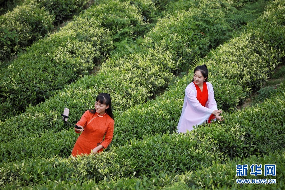 4月30日,網絡主播毛華豔(右)在貴州省餘慶縣白泥鎮春景村郊外的茶園直播,助推山區茶葉銷售。新華社記者 劉續 攝