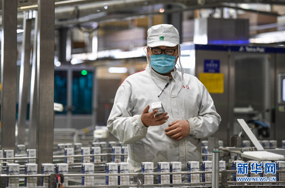 3月19日,技術人員在呼和浩特市蒙牛聖牧高科乳品有限公司的生產車間內檢查產品的包裝情況。新華社記者 彭源 攝