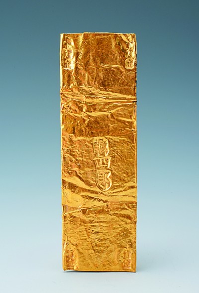 廣東南海一號南宋沉船出土的“韓四郎”金葉子。光明日報記者李韻攝