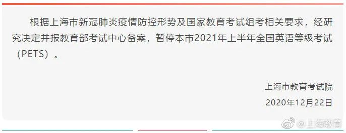 12月22日,據上海教育發佈的公告,根據上海市新冠肺炎疫情防控形勢及國家教育考試組考相關要求,經研究決定並報教育部考試中心備案,暫停上海市2021年上半年全國英語等級考試(PETS)。