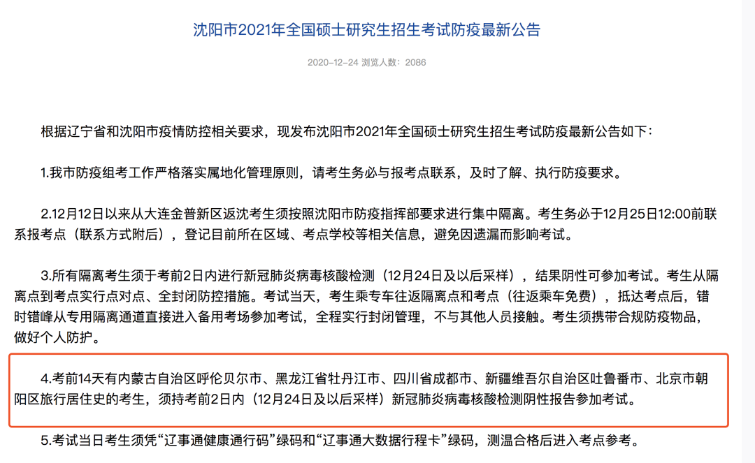 24日,遼寧瀋陽考試院發佈公告,其中明確所有隔離考生須於考前2日內 進行新冠肺炎病毒核酸檢測(12月24日及以後採樣),結果陰性可參加考試。