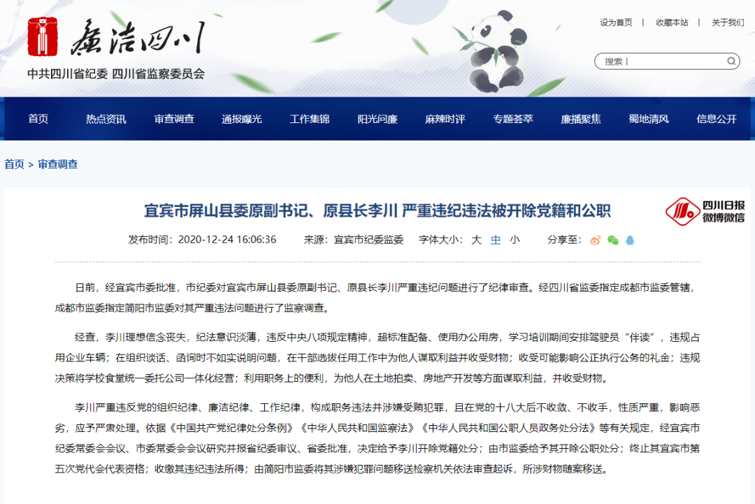 記者12月24日從省紀委監委網站獲悉,日前,經宜賓市委批准,市紀委對宜賓市屏山縣委原副書記、原縣長李川嚴重違紀問題進行了紀律審查。經四川省監委指定成都市監委管轄,成都市監委指定簡陽市監委對其嚴重違法問題進行了監察調查。