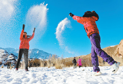 12月20日,遊客在甘肅張掖肅南裕固族自治縣的景區內戲雪。