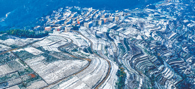 12月16日,浙江新昌縣東茗鄉下巖貝村銀裝素裹,從空中俯瞰美如畫卷。