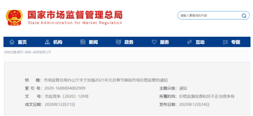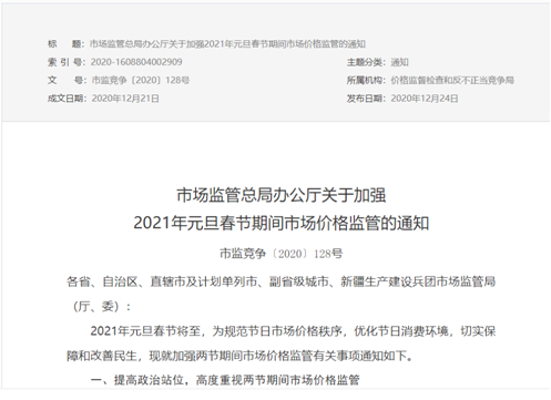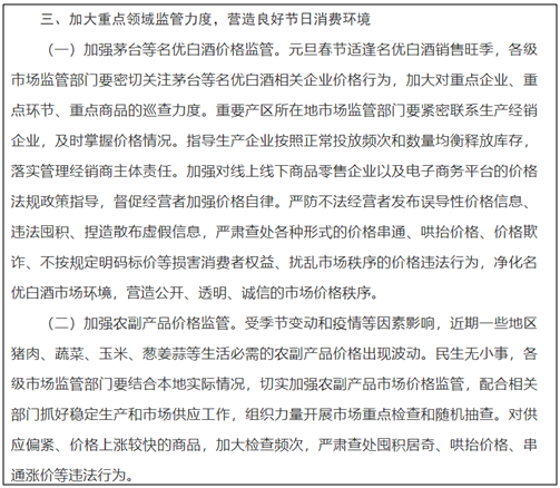 12月24日,從市場監管總局發佈的關於加強2021年元旦春節期間市場價格監管的通知,提到要“加強茅台等名優白酒價格監管。元旦春節適逢名優白酒銷售旺季,各級市場監管部門要密切關注茅台等名優白酒相關企業價格行為,加大對重點企業、重點環節、重點商品的巡查力度。”