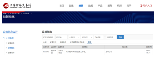 同日,上交所也披露了對貴州茅台的監管工作函,其中涉及對象為上市公司,處理事由為“關於相關事項的監管工作函”,但並未披露具體內容。