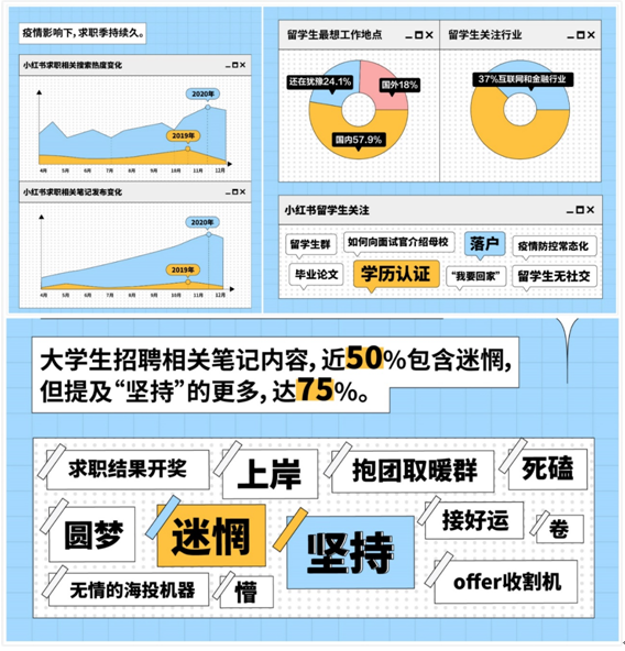報告顯示出疫情對今年求職季產生的諸多影響:留學生歸國求職出現熱潮,小紅書2020年留學生回國求職相關筆記較去年同期增長了近7倍,佔全部留學生內容的82%。