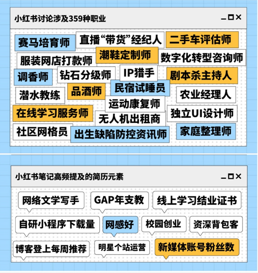 大學生對職業的態度也在發生變化。小紅書社區中求職大學生討論的職業涉及359種,不乏“十四五”規劃中提及的新職業,如數字化轉型諮詢師、社區網格員等。也有一些職業體現出了年輕人的新愛好和需求,如家庭整理師、劇本殺主持人。