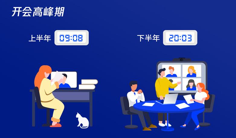 即使是線上辦公,職場人依然毫不鬆懈。在開會這件事上,也呈現了兩種不同的模式。數據顯示,上半年開會高峯時段為上午9點零8分, 2020年下半年開會高峯時段為晚上8點零3分,看來為了不耽誤工作進度,職場人居家時早起,復工後晚歸,同時也驗證了職場人開會總愛遲到幾分鐘的習慣。