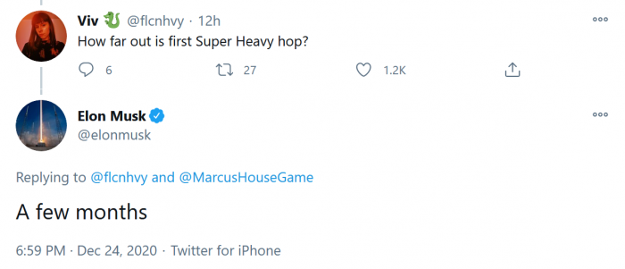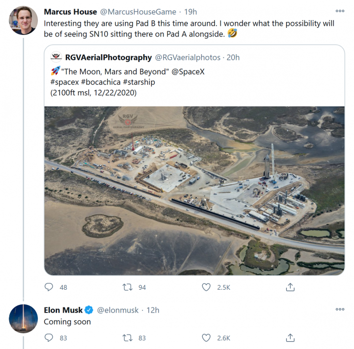 現在,SN9將進行地面測試,之後則有望進行自己的飛行測試。這將為該團隊提供更有價值的數據以便展開進一步的測試 ,據悉,其最終目標是將Starship原型飛行器送入軌道。馬斯克的推文稱,兩個原型機將在博卡奇卡基地的A發射台和B發射台上並排站着,這可能表明測試飛行的速度可能會加快從而能追上SpaceX正在快速構建新的火箭迭代。