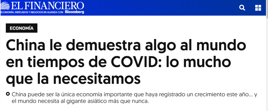墨西哥《金融家報》12月15日發佈題為《疫情期間中國的表現展示了:我們多麼需要中國》的報道指出,全球經濟比以往任何時候都更需要中國經濟的支撐,2021年全球經濟的反彈將依賴於中國延續強勁的復甦勢頭。
