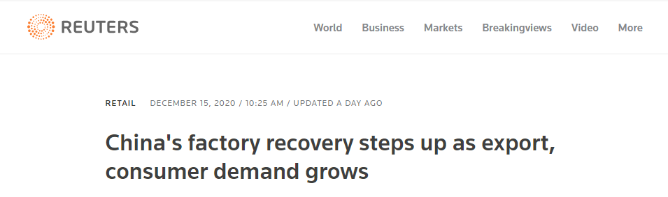 英國路透社12月15日發佈報道指出,今年早些時候,中國經濟就開始從新冠疫情中恢復,並取得了令人矚目的復甦態勢,其中最主要的原因是出口的強勁表現。此外,在雙十一期間,中國電商企業“打開”了消費者的錢包,進一步刺激了工廠的訂單。