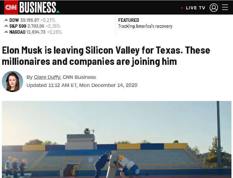 今年年底,硅谷流傳最廣的一條消息是,特斯拉公司首席執行官埃隆·馬斯克在一次採訪中表示,他已經從加利福尼亞州搬到了得克薩斯州。他表示,特斯拉在得州的新工廠正處於建設階段,同時哀嘆加州已經變得過於“自滿”。馬斯克也因此成為新冠疫情期間搬離硅谷的最知名企業家之一。