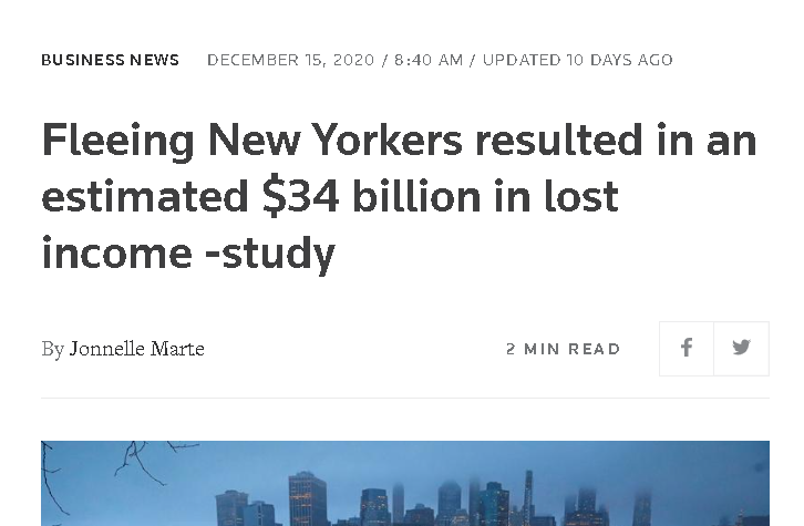 △據路透社報道,一項研究顯示,紐約人口流出造成大約340億美元的收入損失