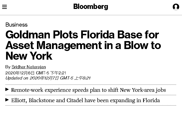 據彭博社報道,高盛集團正考慮在佛羅里達州設立新總部,以容納其資產管理部門。高盛新改組的資產管理部門每年產生約80億美元收入,是集團商業模式多元化的重要支柱。不少市場人士認為,如果高盛遷出這項業務,可能引發其他金融機構仿效,從而影響紐約作為美國金融中心的地位。