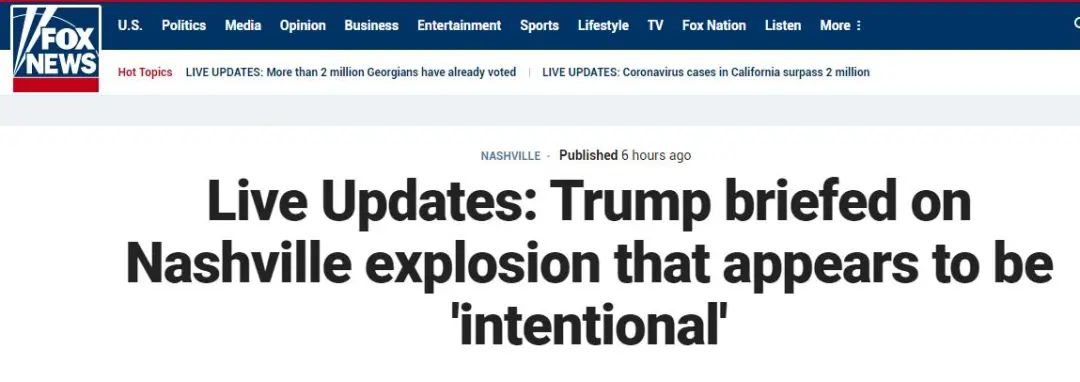 據納什維爾市警方説,爆炸發生在當地時間早上6點30分左右,一輛可疑房車在納什維爾市中心發生巨大爆炸。警方認為這起爆炸事件是“蓄意行為”。