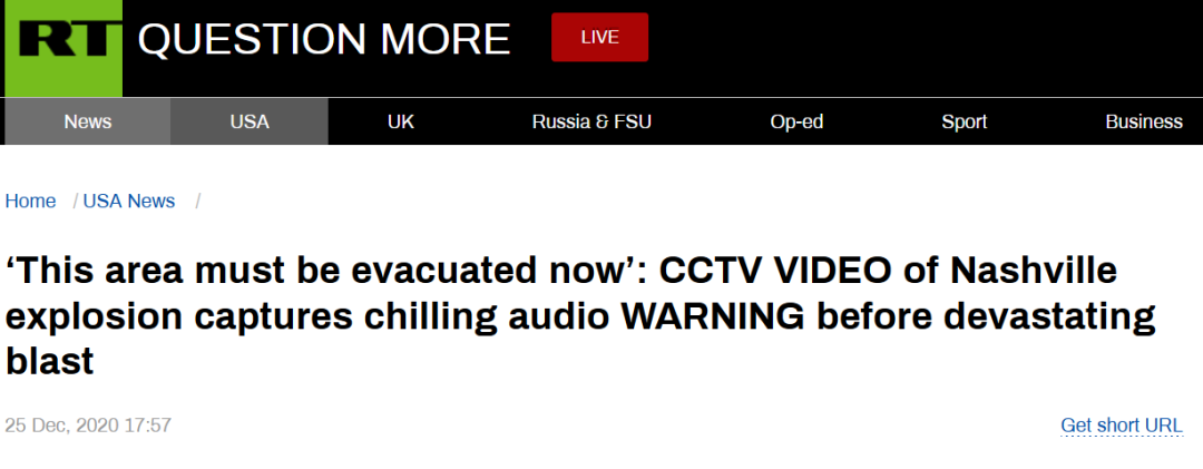 據“今日俄羅斯”(RT)消息,美國南部田納西州首府納什維爾市中心25日早晨發生爆炸事件,造成3人受傷。現場監控視頻顯示一輛房車記錄了爆炸的確切時間。RT稱,爆炸前有一段預先錄製的女性聲音警報,提醒路人撤離。