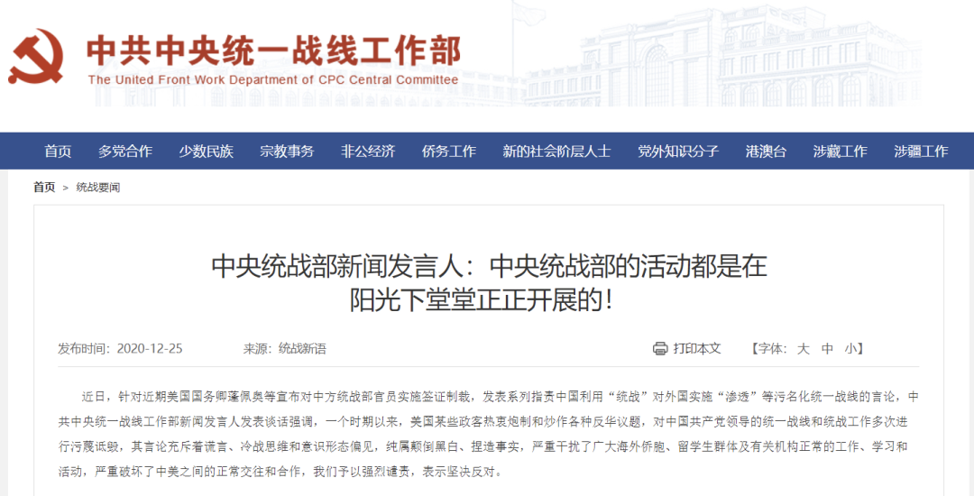 近日,針對近期美國國務卿蓬佩奧等宣佈對中方統戰部官員實施簽證制裁,發表系列指責中國利用“統戰”對外國實施“滲透”等污名化統一戰線的言論,中共中央統一戰線工作部新聞發言人發表談話強調,一個時期以來,美國某些政客熱衷炮製和炒作各種反華議題,對中國共產黨領導的統一戰線和統戰工作多次進行污衊詆譭,其言論充斥着謊言、冷戰思維和意識形態偏見,純屬顛倒黑白、捏造事實,嚴重干擾了廣大海外僑胞、留學生羣體及有關機構正常的工作、學習和活動,嚴重破壞了中美之間的正常交往和合作,我們予以強烈譴責,表示堅決反對。