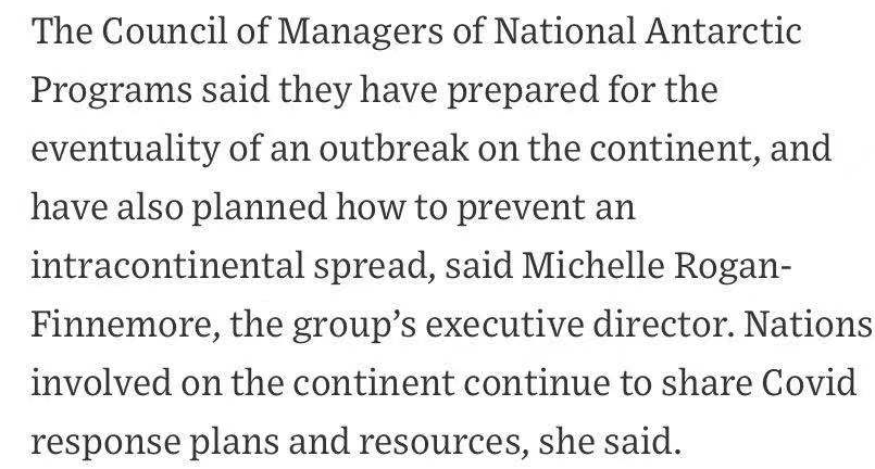 有免疫學家表示,新冠病毒出現在南極洲是一個極其危險的信號。據美聯社報道,國家南極局局長理事會(COMNAP)發表的一份報告指出:南極洲的環境極端嚴峻,這裏的醫療和公共衞生設施的應對能力有限。而新冠病毒具有高傳染性,這可能會導致災難性後果。