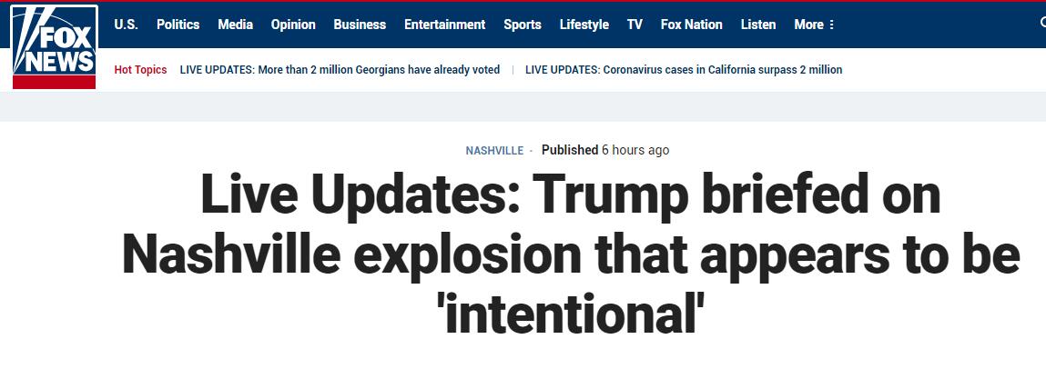 納什維爾市警察局發言人唐·阿倫在新聞發佈會上説,當地時間6時30分左右,一輛可疑汽車在納什維爾市中心發生巨大爆炸,受傷3人已被送醫治療,均無生命危險。警方認為這起爆炸事件是“蓄意行為”。
