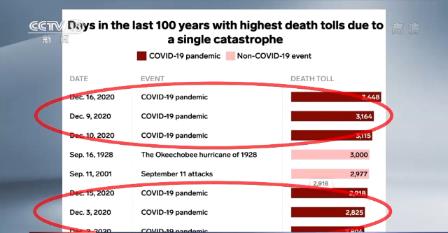 另一張圖,則統計了美國近100年來,各種災難造成的死亡人數排行榜。前8名中,除了1928年佛州颶風排第4,“9.11”排第5外,其餘均為美國12月某1天的新冠肺炎新增死亡人數。