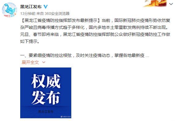 黑龍江省疫情防控指揮部發布最新提示