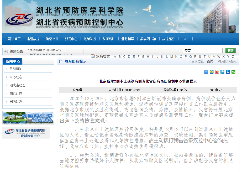 2020年12月26日,北京市新增2例本土新冠肺炎確診病例,病例現住址分別為順義區高麗營鎮和順義區勝利街道,流行病學調查及密接排查工作正在進行中。根據北京市順義區勝利街道、高麗營鎮疫情,為防止疫情輸入,我省將開展北京市順義區勝利街道、高麗營鎮來鄂返鄂人員健康監測管理工作。現對廣大羣眾提出如下疫情防控建議:
