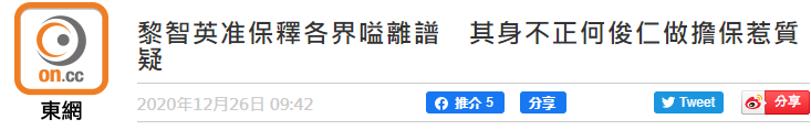【環球網報道 記者 尹豔輝】亂港頭目、“壹傳媒”創辦人黎智英23日獲准保釋,黎智英的保釋條件包括現金1000萬港元,另需3名人事擔保各10萬港元。香港“東網”12月26日報道稱,有人表示3名擔保人與黎智英關係千絲萬縷,其中以民主黨前主席何俊仁與黎智英最同聲同氣,何俊仁早前也曾因涉組織及參與未經批准遊行被捕,質疑何俊仁作為擔保人的資格,認為黎智英應繼續被羈押。