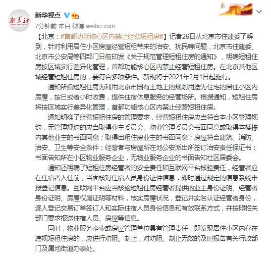 【北京:#首都功能核心區內禁止經營短租房#】記者26日從北京市住建委瞭解到,針對利用居住小區房屋經營短租帶來的治安、擾民等問題,北京市住建委、北京市公安局等四部門日前印發《關於規範管理短租住房的通知》,明確短租住房按區域實行差異化管理,首都功能核心區內禁止經營短租住房。在北京其他區域經營短租住房的,要符合多項條件。新規將於2021年2月1日起施行。