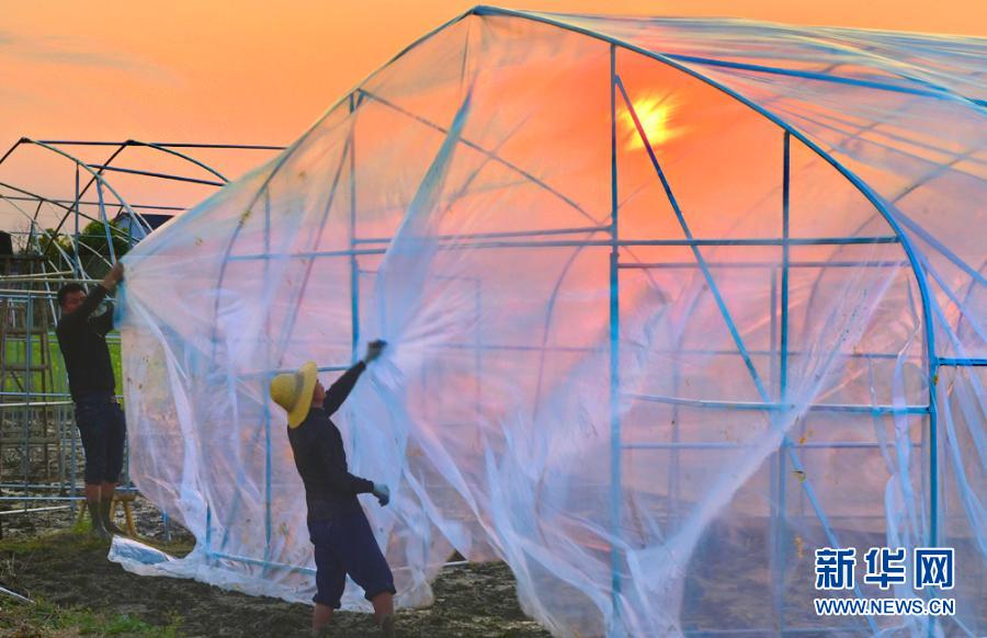 唐髮根(左)在湖南省平江縣中黃村搭建育秧大棚(3月20日攝)。新華社發
